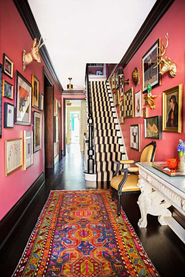 Очень смелое решение: яркие розовые стены и пестрые картины в сочетании с необычным орнаментальным ковром подчеркнут индивидуальность владельца