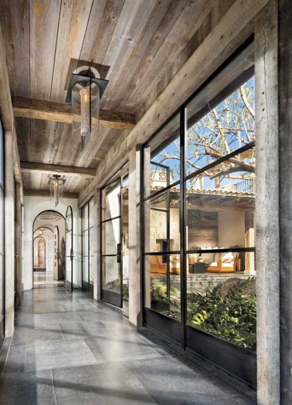 Узкий, но визуально достаточно просторный коридор в частном доме с большими окнами