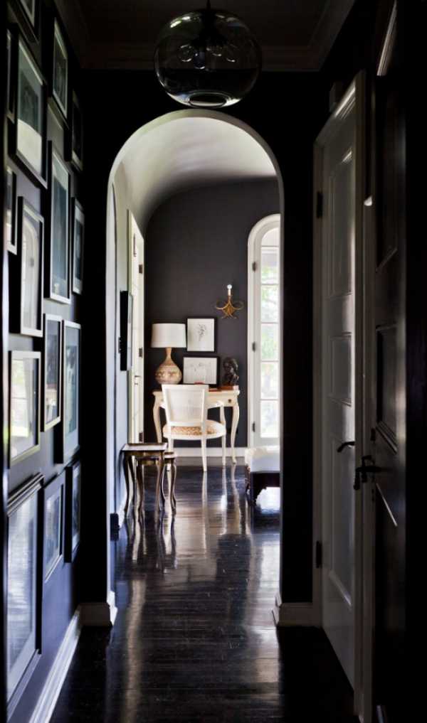 Если она не мрачная, то возможно применить и тёмную отделку, однако, потолок обязательно оставляют светлым. Тёмный потолок визуально уменьшает высоту и ширину помещения, а само оно будет напоминать туннель с гнетущей атмосферой.