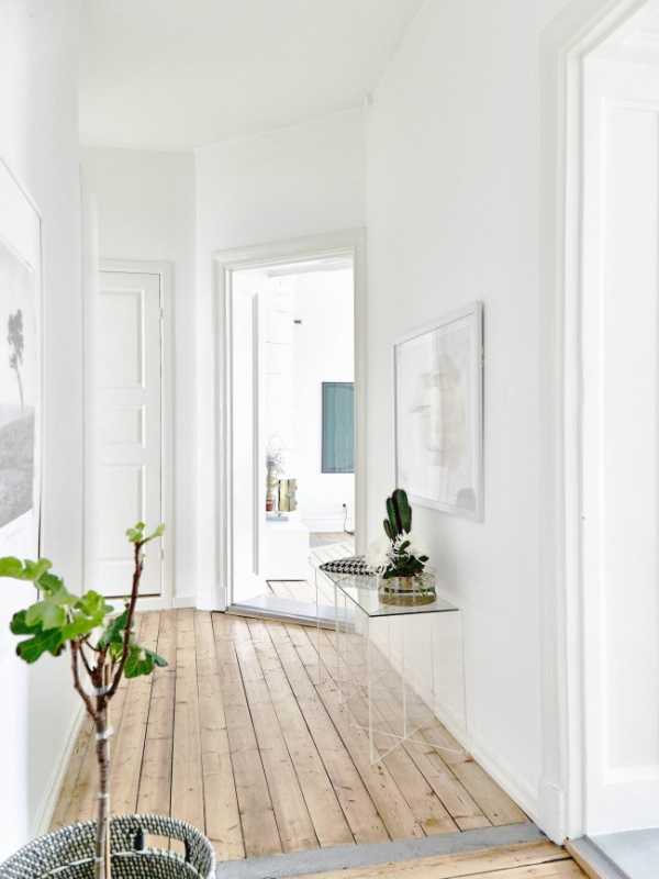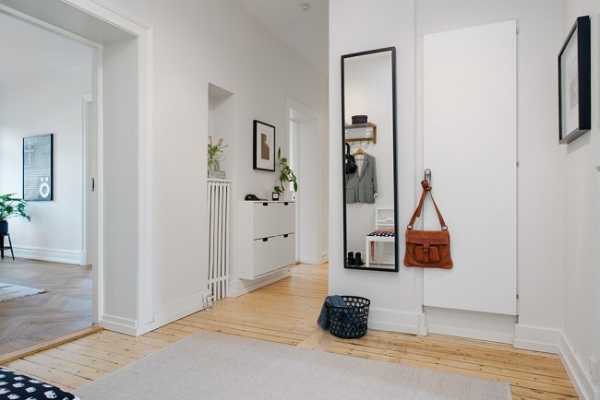 Маленький коридор в белых тонах со светлым деревянным полом. Пространство в таких условиях визуально увеличивается
