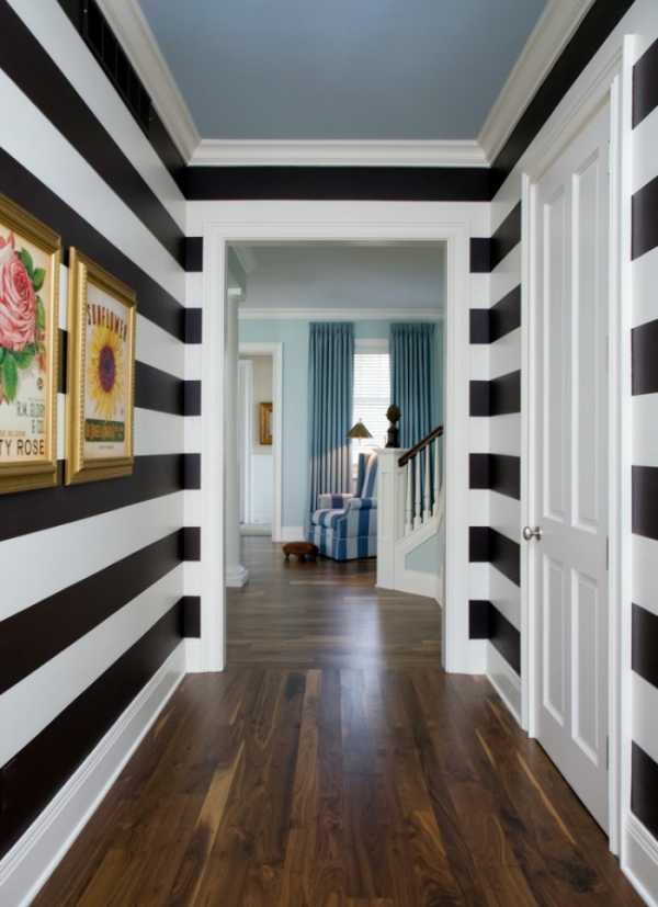 Также расширяет площадь геометрический рисунок — диагональ и горизонтальные полосы или деление стен пополам. Но, в этом случае в светлый цвет выкрашивают только их верхнюю часть. Если же потолок высокий, то тогда тёмные тона располагают вверху.