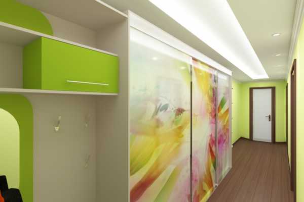 Большой шкаф на всю стену с яркими цветными панелями в узком коридоре