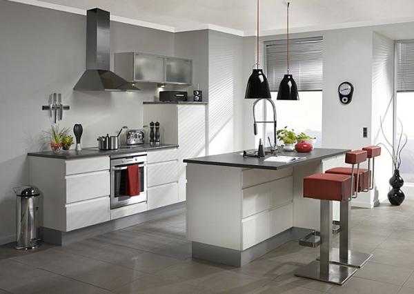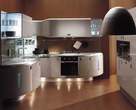 Вариантов подбора интерьеров для кухни очень много, некоторым нравятся необычные футуристические дизайны, элементами которых могут быть причудливые, извивающиеся формы, необычная подсветка, блестящие элементы бытовых приборов и все это на фоне стен, потолка и пола одного цвета.