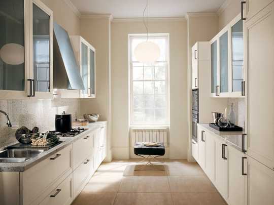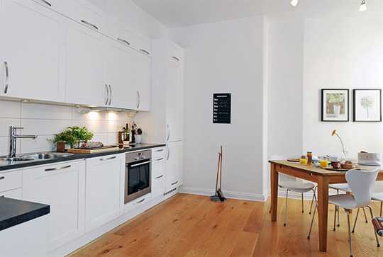 Не единственным, но максимально комфортным становится кухонный гарнитур, размещённый вдоль стены, причём лучше – короткой. Это понятно, ведь пройти по слишком узкой кухне будет сложно, да и стол разместить становится крайне сложно (где ни поставь – всё мешает…).
