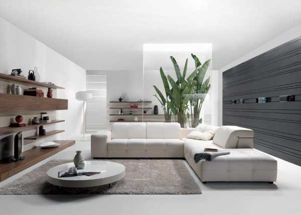 Строгая однотонная мягкая мебель в сочетании с небольшой глянцевой стенкой, тумба, полки, журнальный стол, стеллажи составят интерьер гостиной в этом стиле.