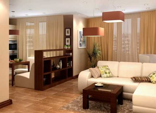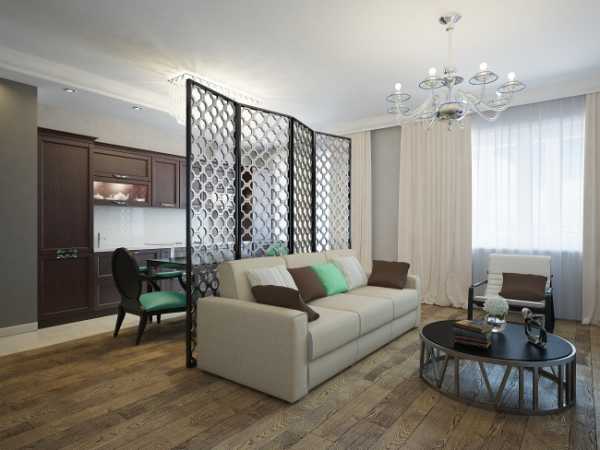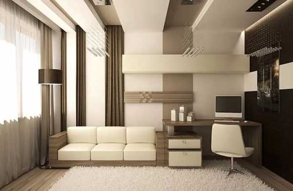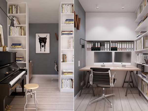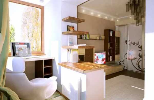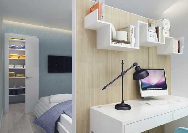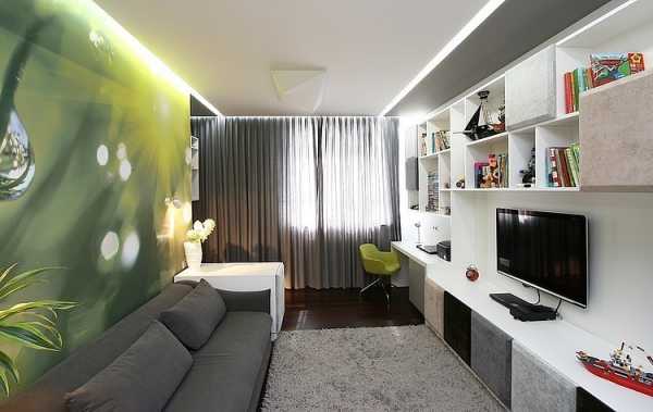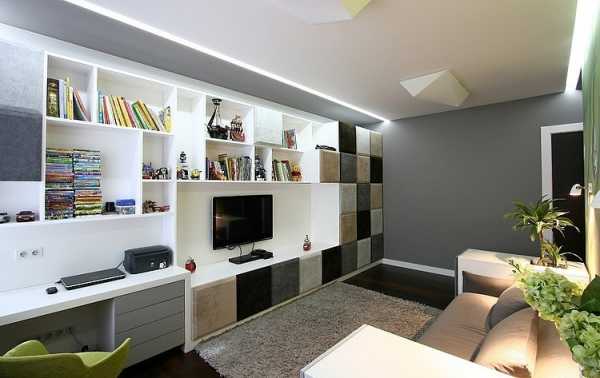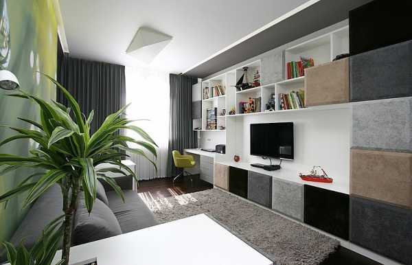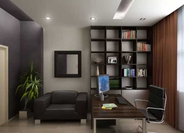 - Рабочее место либо уголок, служащий кабинетом, рациональнее совместить с гостиной, нежели со спальней. Например, расположить по центру гостиной делящий ее на две массивный диван либо продлить вход в гостиную симметричными декоративными перегородками с нишами и полками.