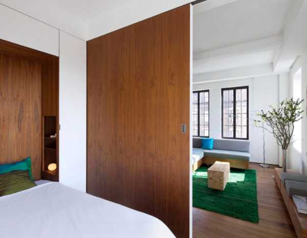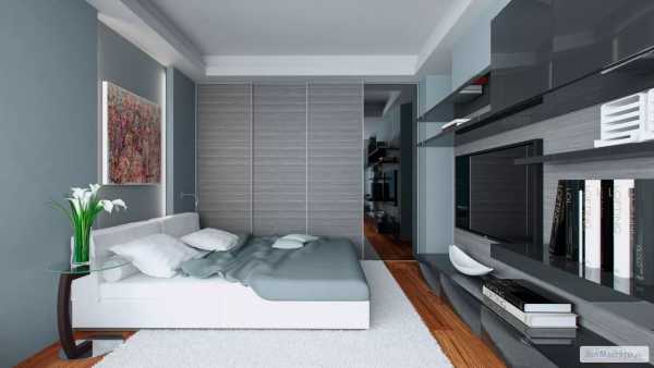 В комнату молодой пары, в интерьере 3‐комнатной квартиры, можно поместить шкаф с раздвижными дверками и кровать, например, на подиуме.