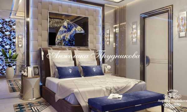 На фото: Спальня в квартире в ЖК «Симфония набережных»Интерьер спальни в стиле ар-деко с синими акцентами и голубоватой подсветкой украшает декоративное панно с изображением бабочки, символизирующей изящество и хрупкость.