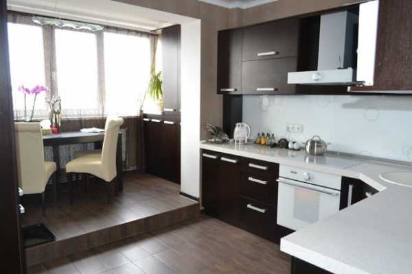 - Демонтировав перегородку между кухней и гостиной, можно существенно увеличить кухонную площадь, «отодвинув» обеденную зону от рабочей и дополнив ее декоративными банкетками – либо поместив обеденный стол на подиум.