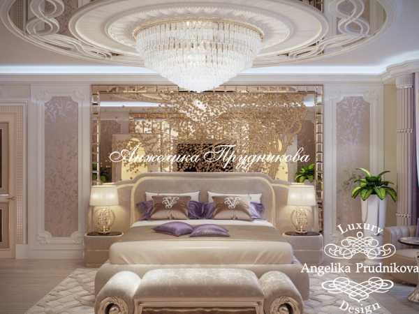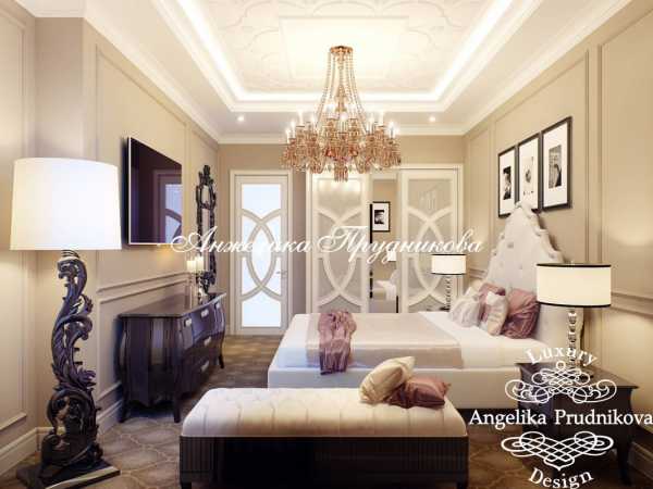 Элементы осовремененного ампира – например, золотистая люстра с лампочками в виде свечей – придаст интерьеру комнаты торжественность и подчеркнет благородство обстановки.