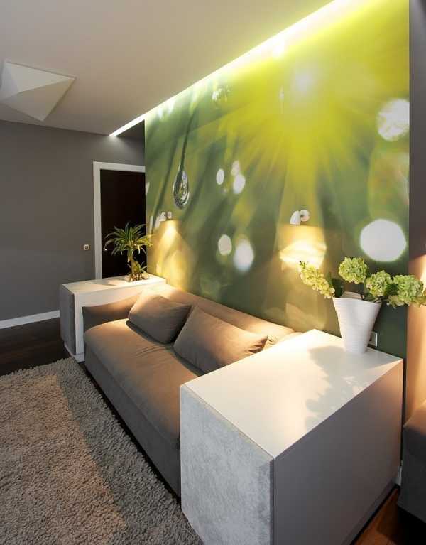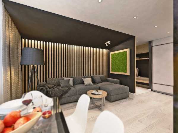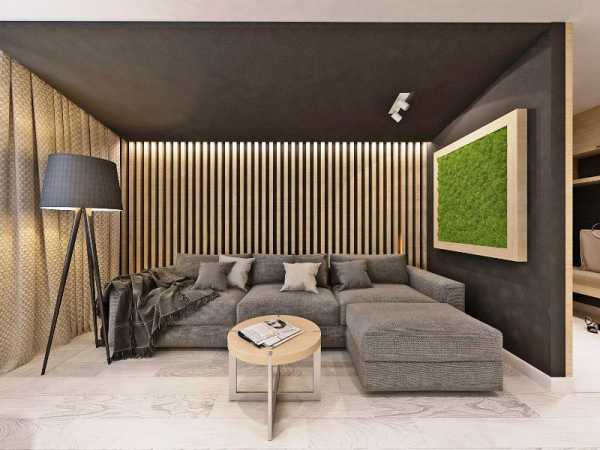 «Теплые» оттенки вертикальных реек из дерева великолепно сочетаются с серой окраской стен и мебели. Рельефное панно в зеленом цвете с подсветкой оживляет интерьер. В дизайне предусмотрен небольшой наклон подвесного потолка, что создает интересный эффект перспективы, а подсветка деревянных планок придает интерьеру легкость.