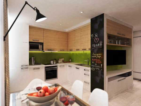 В кухне установлен компактный угловой гарнитур. Гармоничное сочетание текстуры дерева и белого цвета на фасадах, а также зеленой окраски стекла фартука придает кухне современный вид. Доска с черным грифельным покрытием ‐ интересный элемент дизайна трехкомнатной квартиры в современном стиле и возможность оставить напоминающую запись или приятное пожелание.