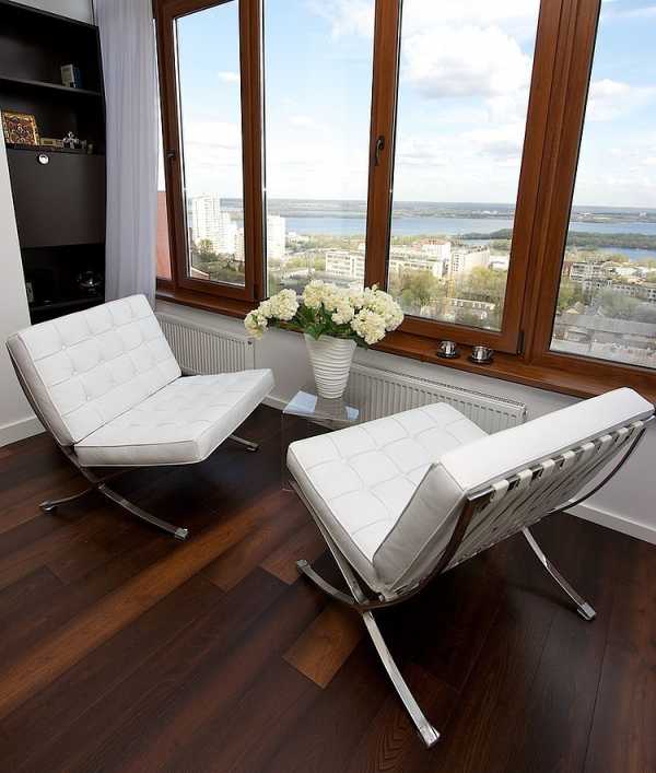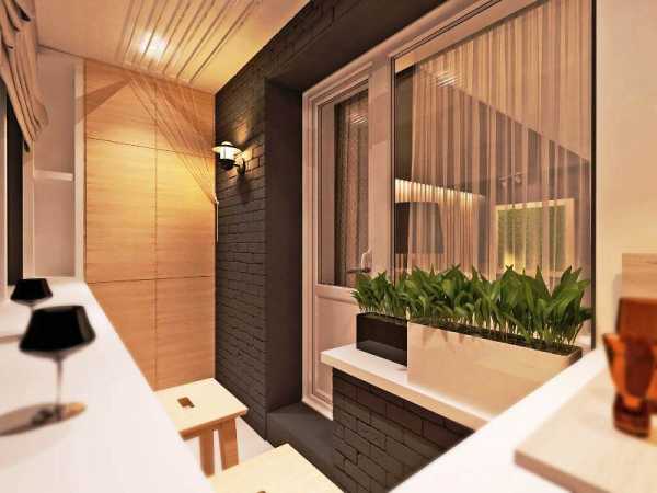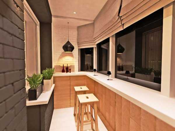Интерьер лоджии в дизайне трехкомнатной квартиры в современном стиле напоминает обстановку бара и располагает к приятному отдыху и общению с друзьями.