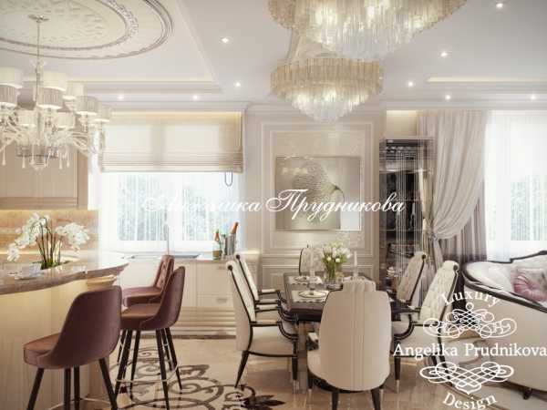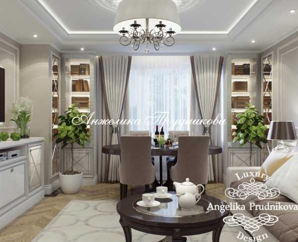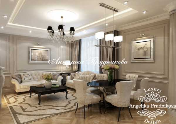 На фото: Интерьер гостиной-столовой в квартиреПроектирование интерьера трехкомнатных квартир представляет собой большой простор для дизайнерской мысли: грамотная планировка и дизайн помещений позволит оборудовать апартаменты для семьи. Согласно современным тенденциям, кухню и гостиную дизайнеры нередко объединяют в студийное пространство, но все зависит от личных предпочтений. В этом обзоре рассмотрим популярные проекты трехкомнатных квартир в разных стилях из портфолио Студии элитных интерьеров Анжелики Прудниковой.