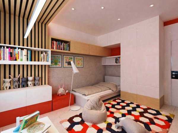Дизайн просторной детской с привлекательными красными акцентами имеет зоны для сна, активных игр и развивающих спокойных занятий. Интересно то, что для зонирования используется комбинация из деревянных реек – еще одна реализация общей идеи дизайна трехкомнатной квартиры. В комнате разместили достаточное количество полок для книг и мест для хранения вещей.