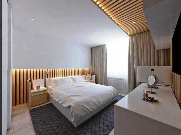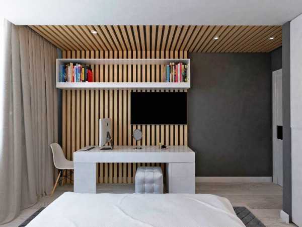 Меблировка спальни ‐ кровать с тумбами и стол, который сочетает функции туалетного столика и рабочего места. Однотонная окраска стен и полка расширяет пространство спальни, а отделка деревянными рейками и серое напольное покрытие вносят разнообразие и помогают создать уют. Открытая полочка с книгами – приятное и полезное дополнение дизайн-проекта.