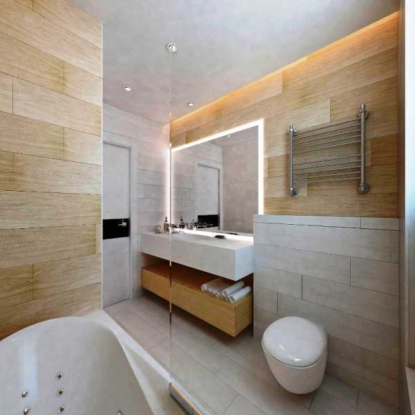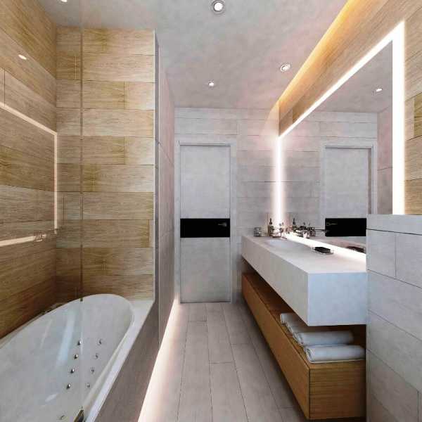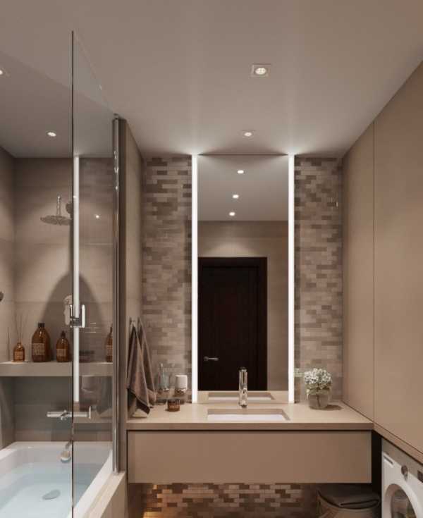 Сочетание легких розовых и коричневых оттенков, подсветка зеркала и фартука – главные достоинства в дизайне ванной.