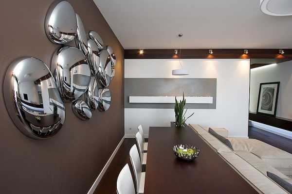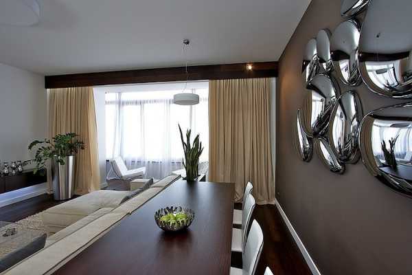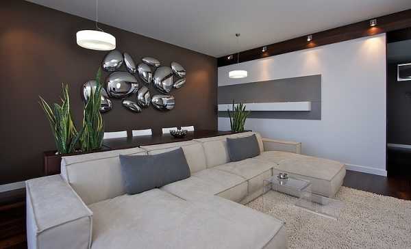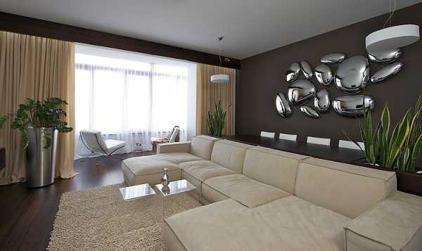Просторная гостиная в серо-бежево-коричневых тонах одновременно строга и роскошна. Объемный зеркальный декор, украшающий главную стенку, является не только стильным украшением и изюминкой интерьера, но и дополнительно расширяет пространство и делает помещение светлее.