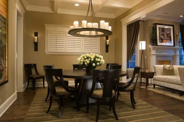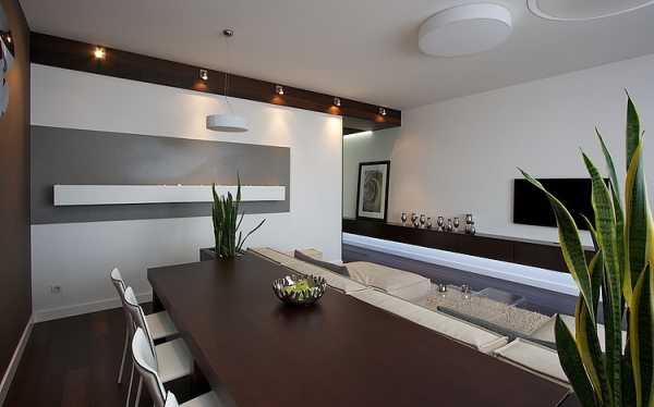 Необычная идея пришла в голову авторам проекта, и они выделили место для столовой в гостиной за диваном. В таком решении есть существенные плюсы: в поле зрения отдыхающих на диване не попадает обеденный стол, а во время семейной трапезы и угощения гостей можно смотреть телевизор и наслаждаться многогранной обстановкой гостиной.