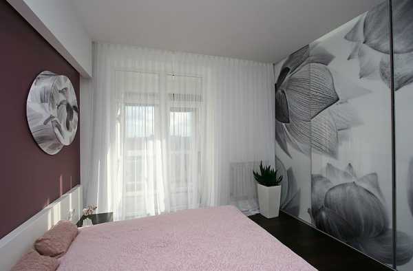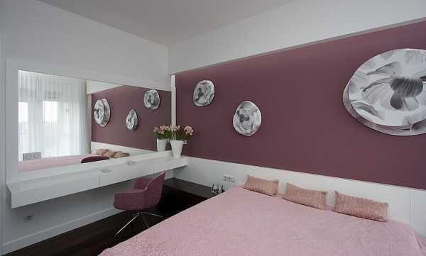 Небольшая спальня выигрывает благодаря зеркалу, отражающему большую часть комнаты. Туалетный столик с выдвижными ящичками превращает эту зону в красивый будуар, где хозяйка дома с удовольствием начинает свое утро. Дверцы вместительного шкафа-купе выполнены из стеклянных панелей с фото-печатью. Грязно розовый цвет расслабляет и настраивает на спокойный и восстанавливающий отдых. Этот оттенок одинаково привлекателен и для женщин, и для мужчин.