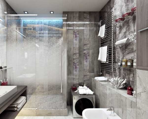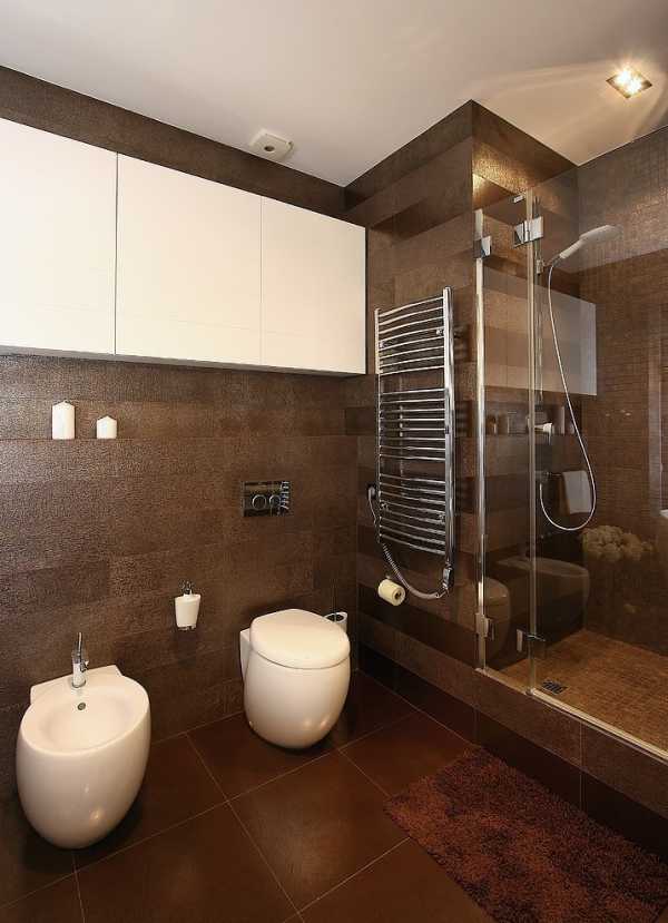 В интерьере трехкомнатной квартиры в современном розовый оттенок плитки, текстура дерева и блеск металла придают санузлу элитный вид.