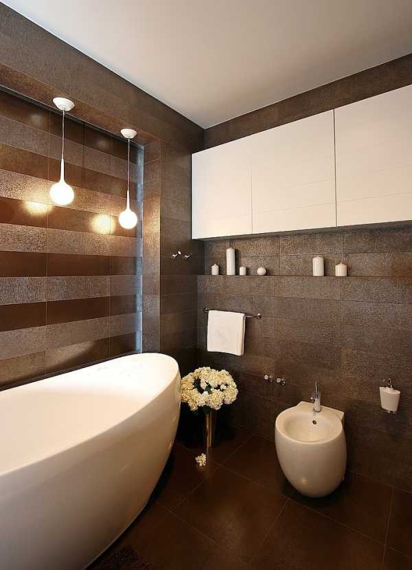 Совмещенный санузел превратили в шикарную ванную комнату. Благодаря большому зеркалу и хитро размешенным светильникам помещение увеличилось как минимум в пол раза. Все предметы сантехники имеют закругленную обтекаемую форму – здесь нет углов и четких линий. Для гигиенических процедур есть отгороженная стеклянной дверцей душевая кабина, а роскошная ванна, расположенная прямо на полу, служит для релаксации и наслаждения.