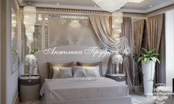 На фото: Интерьер спальни в стиле ар-деко с зеркаломИнтерьер спальни в стиле ар-деко делает особенно роскошным зеркало с золотистым художественным напылением за изголовьем кровати, изготовленное по авторскому эскизу дизайнера Анжелики Прудниковой.
