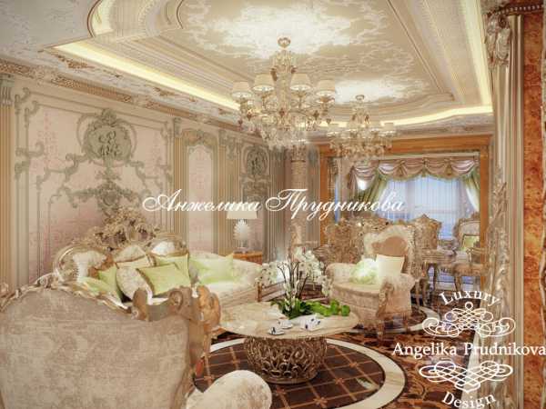 На фото: Дизайн гостиной в стиле барокко в квартире на ЛенинскомРыжевато-золотистые и фисташковые оттенки прекрасно сочетаются в интерьере роскошной гостиной в стиле барокко в квартире на Ленинском проспекте. Обилие лепнины и других декораторских элементов уравновешивается утонченной колористической палитрой.