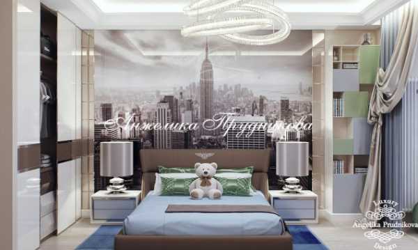 На фото: Дизайн детской спальни с фотообоямиСовременный облик интерьеру детской комнаты в трехкомнатной квартире придают фотообои с изображением мегаполиса, а также дизайнерская люстра в футуристическом стиле.