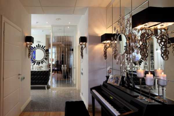 На фото: Интерьер холла в стиле ар-декоИнтересным решением интерьера холла в трехкомнатной квартире станет отделка золотистыми элементами, а также декорирование с помощью бра в стилистике ар-деко и декоративными панно.