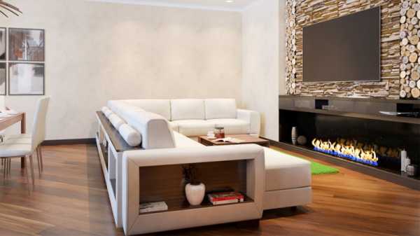На фото: Дизайн диванной зоны в бежевой гостинойЕще один вариант обустройства камина в городской квартире – встроенный биокамин, который нередко располагается в ТВ-зоне, рядом с диванами. Стена со встроенным биокамином отделана слэбами из натурального мрамора.