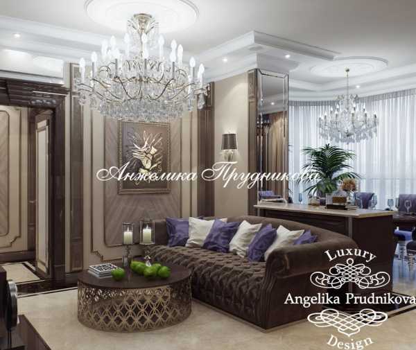 Роскошные люстры с лампочками в виде свечей освещают гостиную и столовую зоны студийного пространства квартиры в стиле ар-деко в темно-коричневых тонах с фиолетовыми акцентами.