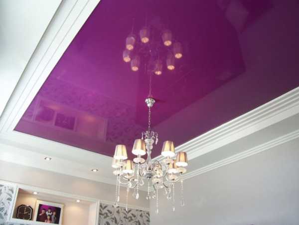 Потолок в сиреневой гостиной может быть как кипенно-белым, так и разных оттенков сирени. Идеален потолок с глянцевым покрытием, он всегда смотрится по-современному и усиливает изысканность комнаты. Романтизма комнате можно добавить, если потолок будет светящимся.