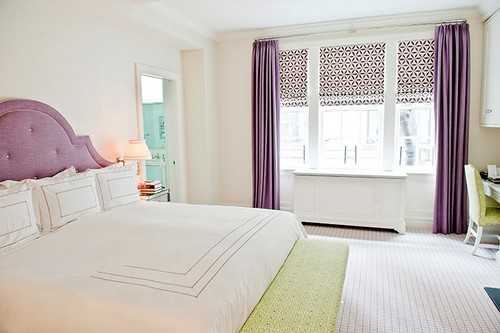Этот тон довольно часто применяют в интерьере спален. Фиолетовый как и синий, может успокоить и расслабить, но при этом в нем есть чувственность красного, и из-за этого такое помещение обладает особой эмоциональностью, вследствие чего идеально подойдет для супружеских спален. Не применяйте фиолетовый в больших количествах, это сделает спальню слишком мрачной, лучше комбинировать его с другими цветами, в результате можно получить потрясающий эффект.