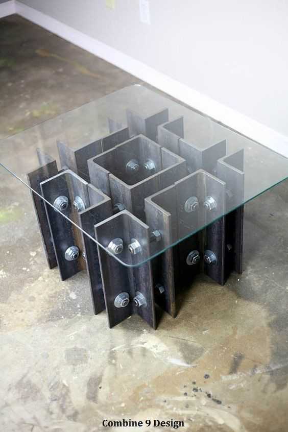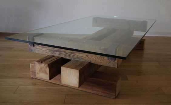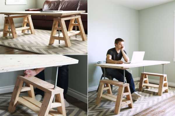 Что если ваш журнальный столик будет в индустриальном стиле? Если вам нравится эта идея, взгляните на данный вариант. В базе находятся козлы для пилки дров. Он имеет регулируемую по высоте столешницу, благодаря чему может запросто превратиться в письменный стол. Однако сам процесс трансформирования несколько длительный и довольно неудобный, но надежный.