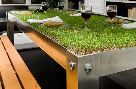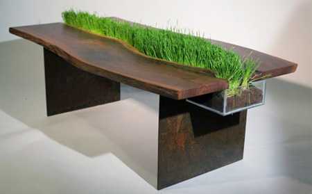 В разъем посередине столешницы вмонтирован ящичек с землей и живая зелень растет прямо из стола. Вам остается только позаботиться, чтобы растения получало достаточно света для роста. Хорошо иметь такой столик на веранде, в оранжерее или на балконе.