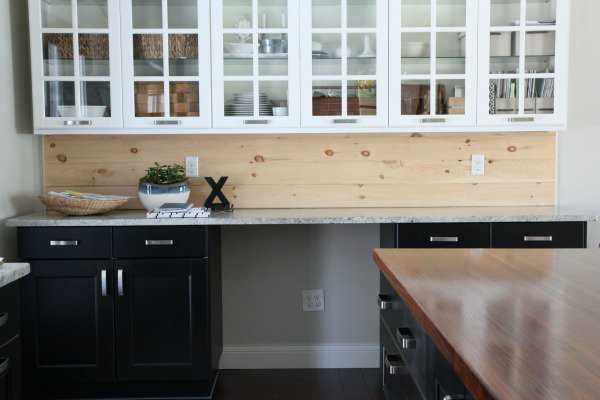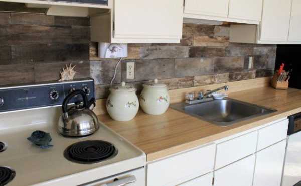 Деревянные доски добавляют нотки деревенского стиля. Чтобы сделать такой фартук, понадобится тонкий кусок фанеры точно по размеру стены. Все доски разрезают до нужной длины и прикрепляют к фанере, а затем все это привинчивается к стене.