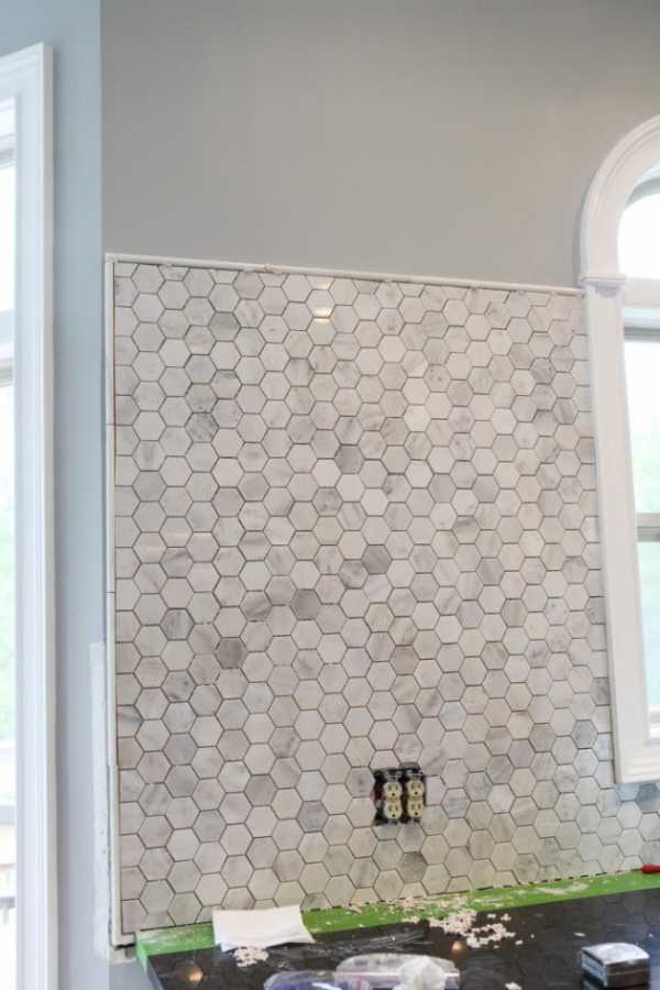 Создайте мозаичный фартук с вашим собственным рисунком, используя мелкую плитку разных цветов. Например, в данном случае понадобилась темная коричневая плитка для пола.