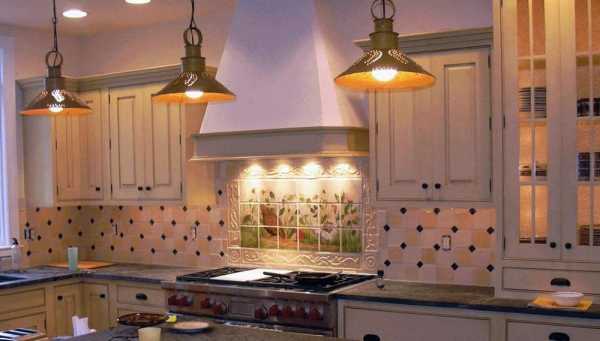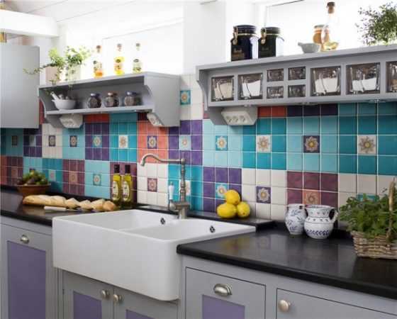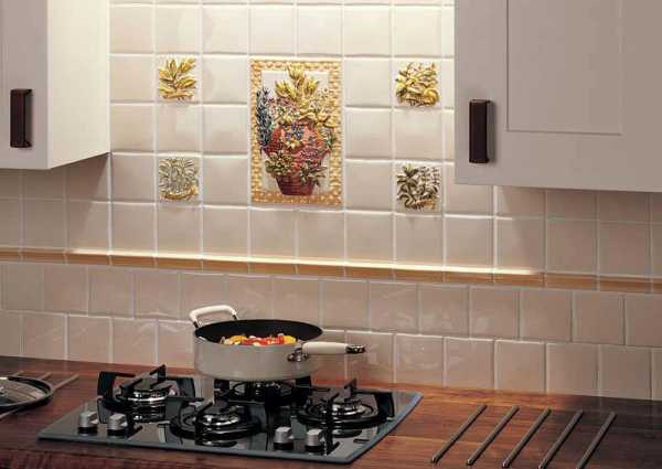 Керамическая плитка, подобранная в контрастных, но гармонирующих цветах, а также небольшое панно в центре, делают эту кухню привлекательной и оригинальной