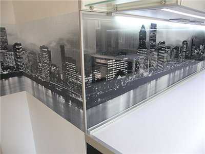С точки зрения эксплуатации такой фартук замечателен тем, что на его поверхности, неоднородной в цветовом отношении, практически незаметна грязь. Стыки между элементами фартука не бросаются в глаза, а оригинальный городской пейзаж — еще один «плюс»
