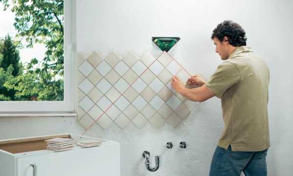 - Выкладываем первый ряд и разделяем плитки между собой нарезанными из крестиков клиньями.