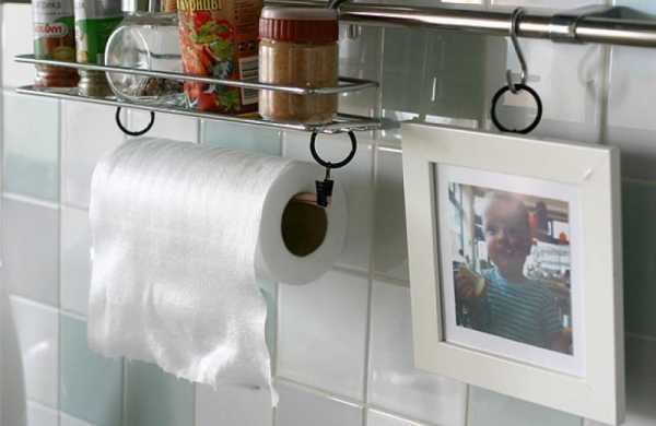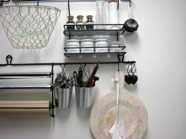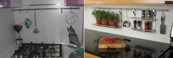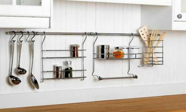 Рейлинги подвешиваются, как правило, под навесные шкафы. На них располагаются крючки и полочки: