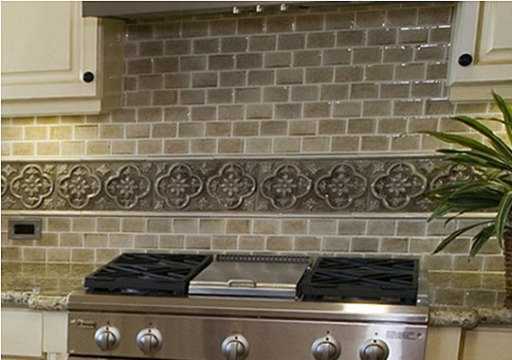 Этот фартук изобилует стыками между плитками, а чистка рельефного бордюра может стать настоящим испытанием, зато рабочая стенка, оформленная таким образом, выглядит роскошно и стильно