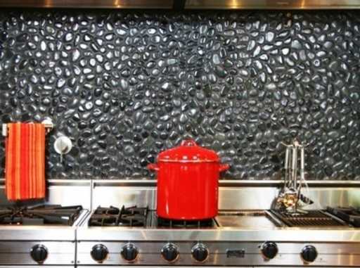 Убиваем двух зайцев: на этой рабочей стенке, отделанной натуральной галькой черного цвета, проявляется вся красота камня и практически не видна кухонная грязь