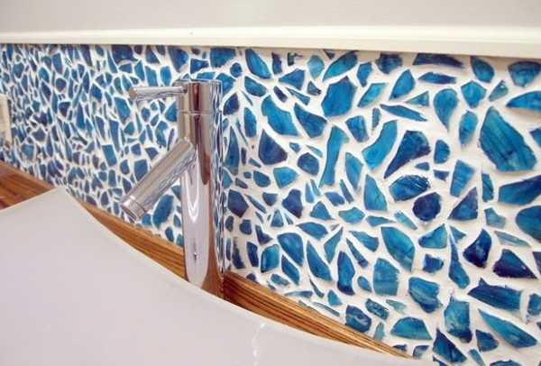 Также создать мозаичный узор можно, разбив большую плитку на более мелкие кусочки, прежде чем крепить на стену. Результат получается похожим на предыдущий, но более хаотичный, без четких линий.
