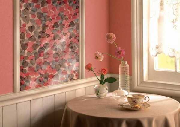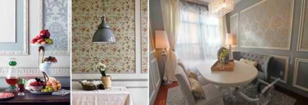 Если размер кухни не позволяет выделить обеденную зону, то можно разместить над столом вставки из полотнищ другого цвета или обоями с рисунком и оформить их по периметру молдингами. Появится эффект нескольких картин.