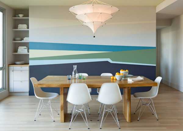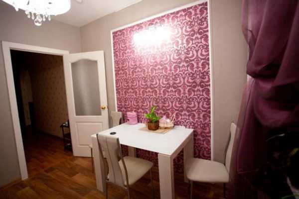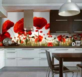 В маленьких квартирах постройки конца 60-х, начала 70-х годов прошлого столетия с кухней 5-6 метров место расположения обеденного стола выделяют полосой из двух – трех полотнищ или акцентируют внимание на эту стену с помощью не широких фотообоев.