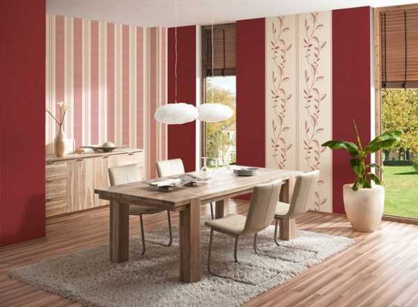 Данный прием основан на одном из свойств, которые характерны для использования вертикальных полосок в интерьере. Давно подмечено, что вертикально расположенные полосы имеют обыкновение зрительно «увеличивать» высоту потолков. Таким образом, в том случае, если вы живете в хрущевке или любой другой аналогичной квартире с низкими потолками, вы сможете без труда создать визуальную иллюзию более высоких потолков. При этом, можно говорить про разное комбинирование обоев: фото на кухне наглядно демонстрируют эту разницу. Перечислим основные виды вертикального комбинирования: