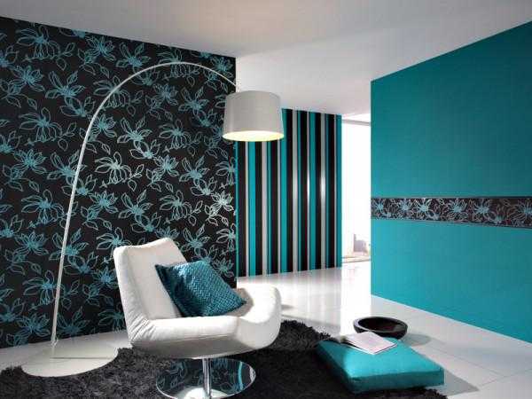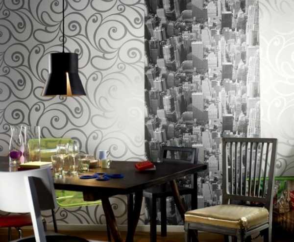 - Универсальный способ. Для этого комбинируем обои черного, белого или серого с яркими или темными оттенками – для получения более мягкого эффекта. А вот светлые и тусклые тона при помощи этих цветов можно выделить и подчеркнуть их красоту.