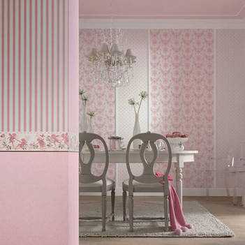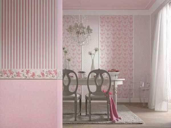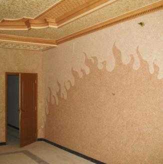 | Объёмные вставки | Такой способ можно использовать также для обновления старого покрытия. Вырезаются будущие картины различной формы и клеятся поверх готового слоя обоев. Дальше вставки обрамляют планками или бордюрчиками. Очень популярны вставки со значительным орнаментом, но они будут уместны лишь при однотонном нейтральном нижнем слое |
